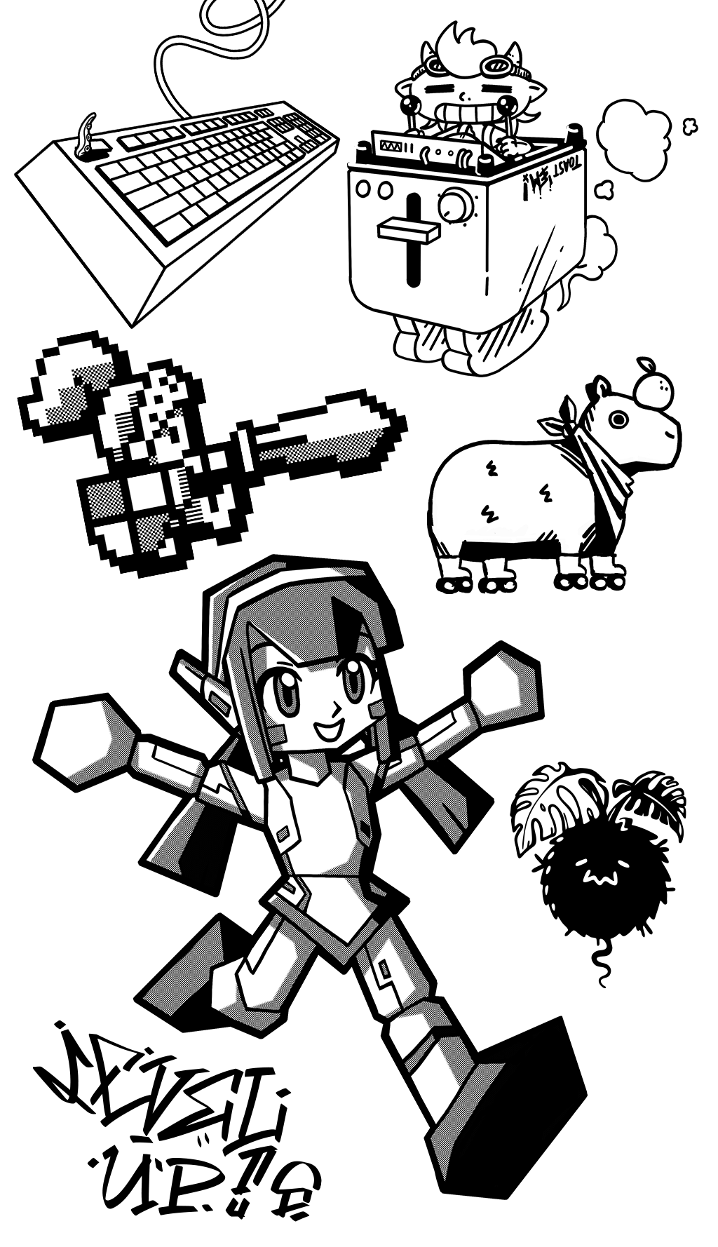 Whimsical decorative objects which were used for a mural in an office. They had to be generic and are varied to showcase a wide range of styles. The colors were restricted to be black and white only. Multiple artists collaborated to create a vivid mural; the illustrations shown are exclusively my submissions.